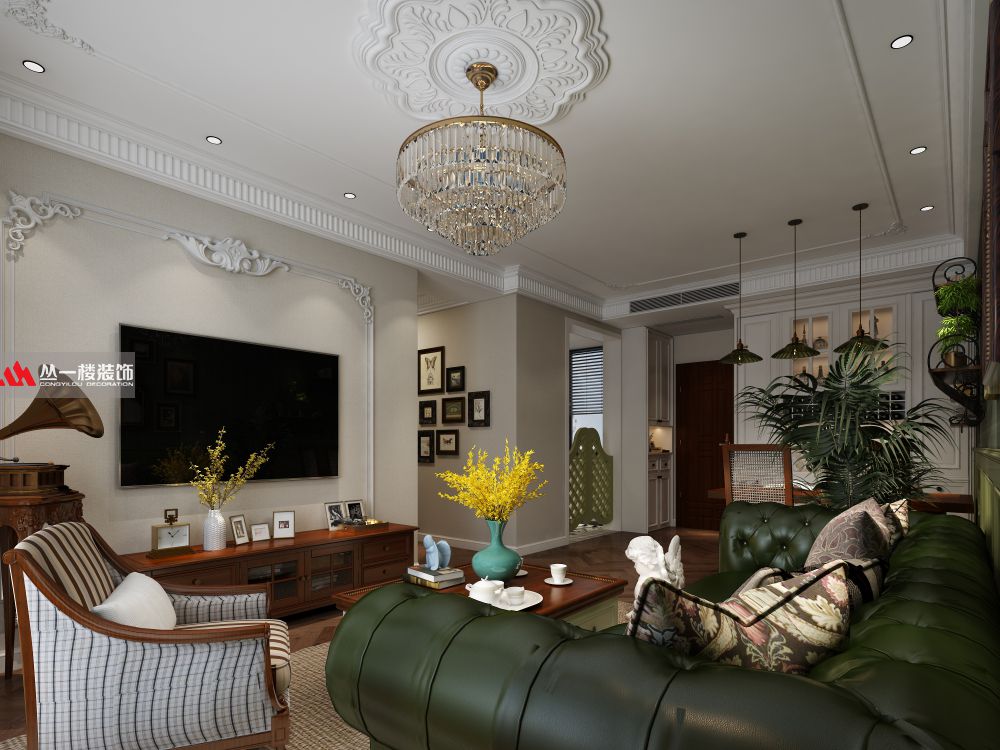 客餐厅统一背景色,选用双拼色的涂料,在墙面的腰线位置做区分,让空间赋予层次感。餐桌较传统美式餐桌做了简化,既保留了美式风格元素,又更适合小面积使用。